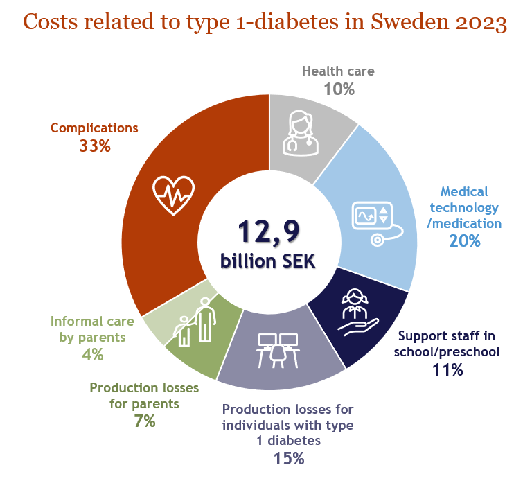T1D leads to significant societal economic costs that are spread across different sectors of society. In a recently published IHE report (IHE Report 2025-15), the total cost of T1D in Sweden was estimated to nearly 13 billion SEK in 2023, with a large portion (33%) of the costs driven by diabetes related complications.